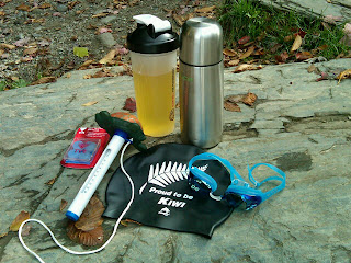 Practice wraps up and we all laugh as we discover leaves, pine needles and sap stuck to some strands of hair that has slipped out from under my swim cap, a fun memento from my early morning foliage dip.