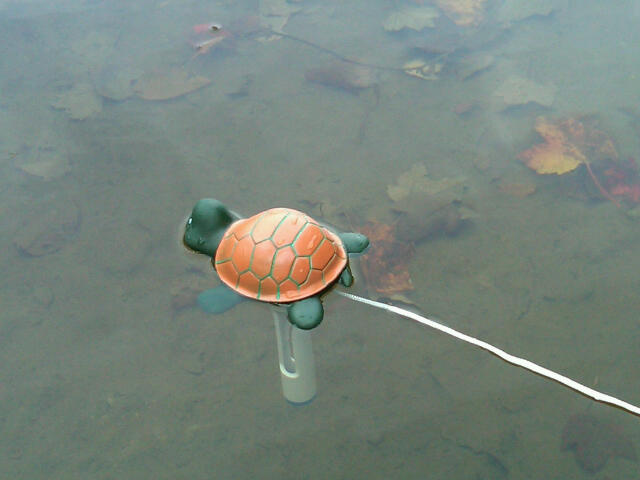 My hands are cold  gripping the steering wheel as I drive, when I arrive at the pond it looks frigid, ” now or never” , I think as I turn off the car, earplugs in, cap on, possum hat on, furry hood up and I am off down to the pond by foot, the turtle goes in first and checks out the water temperature stats as I dash back up to the car to get my camera,” I have to get a photo of the pond today”, I take a picture then fish out the turtle and check out the temperature reading, 51.5 degrees, OK that is an all time low for me and below the 55 degree cut off mark, I had told myself less than one hour before that  I would not swim in the pond today below 55 degrees, but I am already here, my ear plugs are in and I am curious to know what 51.5 degrees will feel like. I tried to swim in 52 degrees this spring, on May 16th, 2010 the water was 52 degrees and the air temperature was 60 degrees, I put on a 5mm wetsuit and was only able to swim a mere 42 minutes, my notes from that swim include: