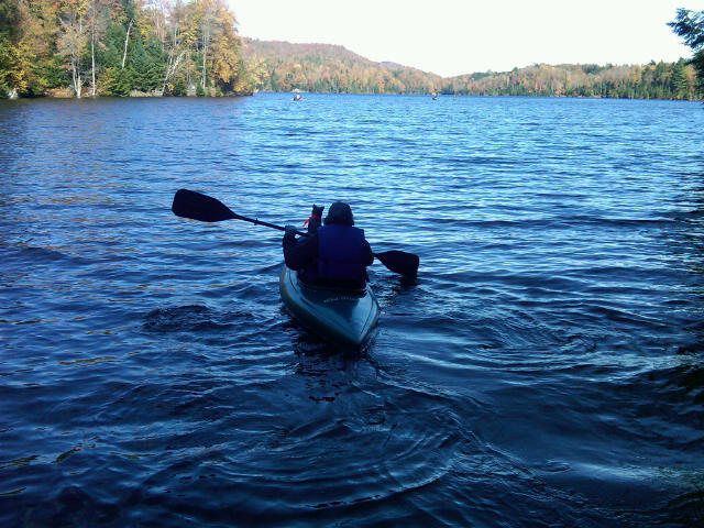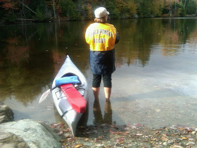 The Turtle does not say that, he answers quite confidently 53 degrees, ” lady you are going swimming”, all right then, I think, action stations, ear plugs in, cap on, pants off, I leave my big Burton jacket on as we lug the boat down to the canoe launch, it takes about 4-5 minutes, my right shoulder is aching from carrying the boat, Jeff gets in the Kayak and as I take off my heavy jacket I look out to the deserted lake, during the summer months it used to be so alive with people, canoes, kayaks, loons, people camping and fishing, no longer, it is desolate and remote feeling.